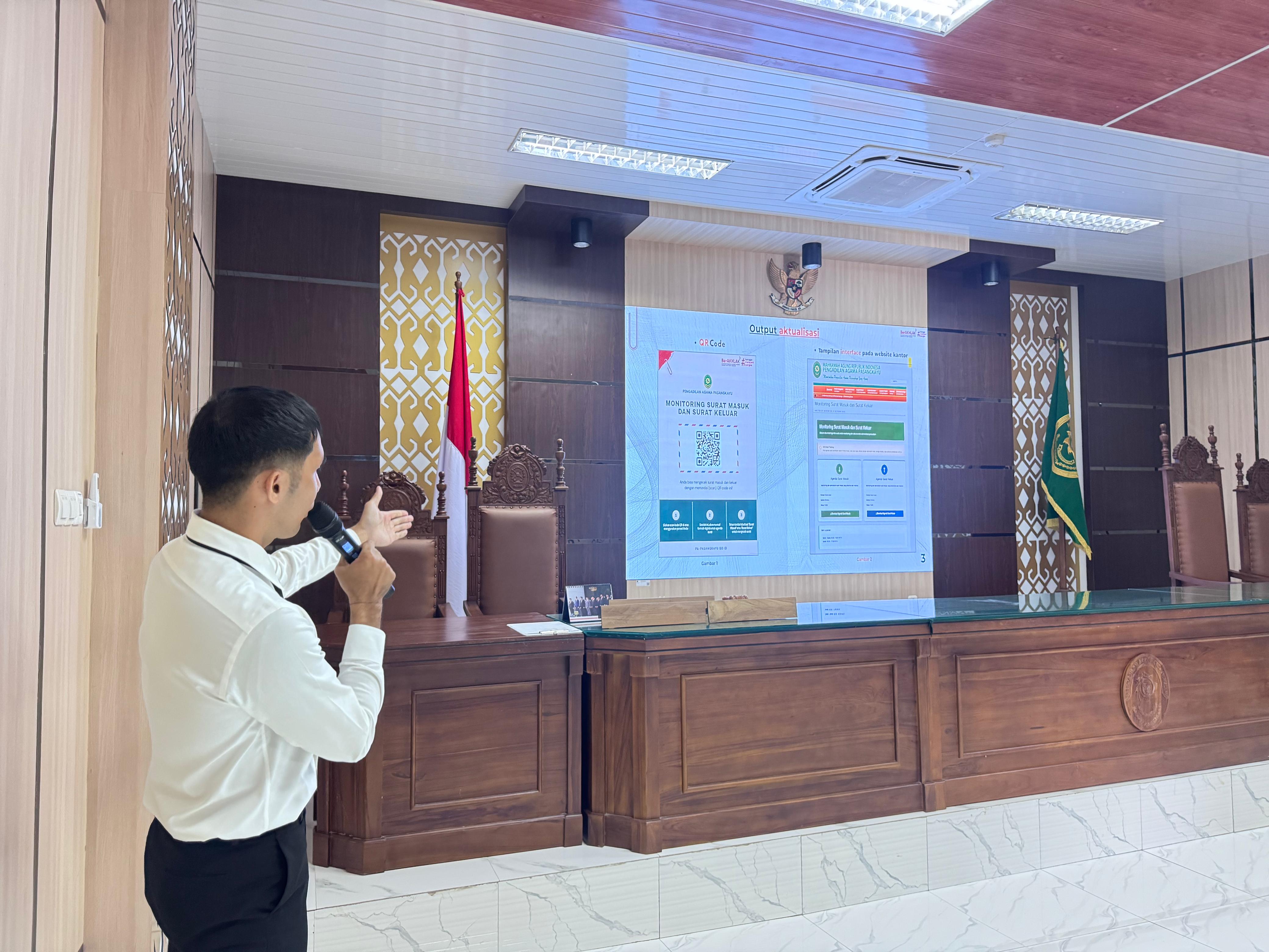 Empat orang CPNS Pengadilan Agama Pasangkayu melaksanakan presentasi (Nurlaela, S.H., Aulia Amri, S.T., Dahsyat Ramdhiani, S.H., Fajar Septiawan, A.Md.) melakukan sosialisasi dan presentasi hasil aktualisasi tentang rancangan aktualisasi sebagai bagian dari rangkaian kegiatan Pelatihan Dasar Calon Pegawai Negeri Sipil Mahkamah Agung RI tahun 2024.