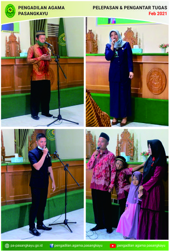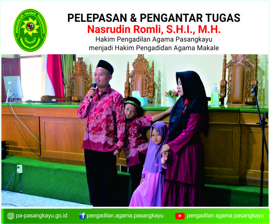 Keluarga Besar Pengadilan Agama (PA) Pasangkayu mengadakan acara Pengantar Alih Tugas. Bertempat di ruang utama sidang, acara diikuti oleh seluruh hakim, pegawai, CPNS, dan karyawan honorer PA Pasangkayu. Acara ini bertujuan untuk memberikan kenangan dan tanda terima kasih kepada Bapak Nasrudin Romli, S.H.I., M.H. dari Hakim di PA Pasangkayu menjadi Hakim PA Makale.
