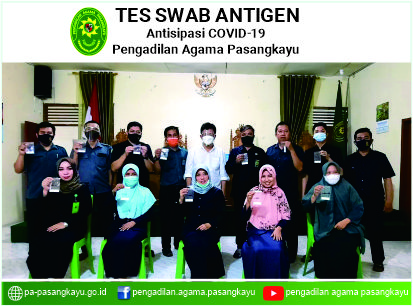 Selasa, 12 Januari 2021, Pengadilan Agama Pasangkayu menyelenggarakan Swab/Rapid Antigen kepada Hakim, Aparatur Sipil Negara (ASN), dan Seluruh Pegawai Pemerintah Non Pegawai Negeri (PPNPN). Kegiatan ini dilakukan untuk mengantisipasi dan memutus penyebaran virus Covid-19 di area kantor Pengadilan Agama Pasangkayu.