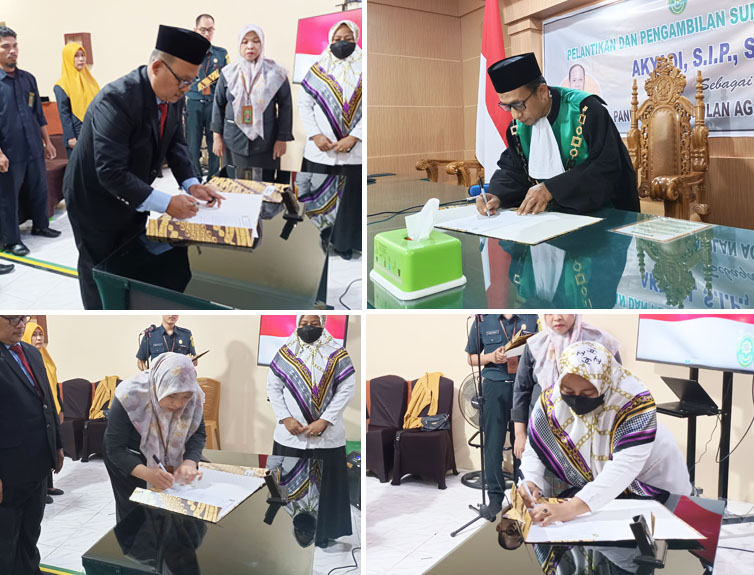 Kemudian dilanjutkan dengan Pelantikan dan Pengambilan Sumpah Jabatan yang dipimpin langsung oleh Ketua PA Pasangkayu YM. Bapak Amar Ma’ruf, S.Ag., M.H. dengan disaksikan oleh Saksi-saksi serta Rohaniwan. Setelah itu dilanjutkan dengan penandatangan Berita Acara Pelantikan dan Pakta Integritas oleh pejabat yang baru dilantik.