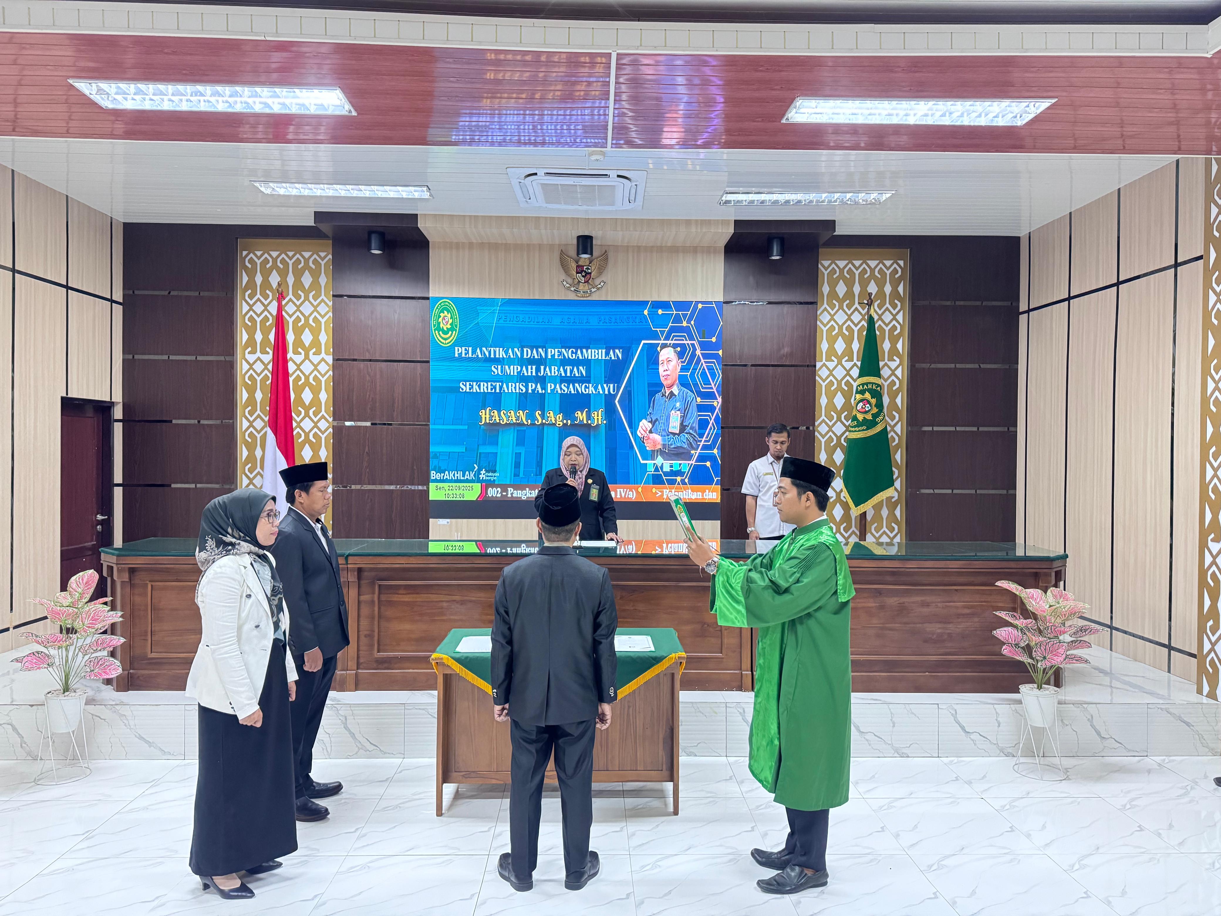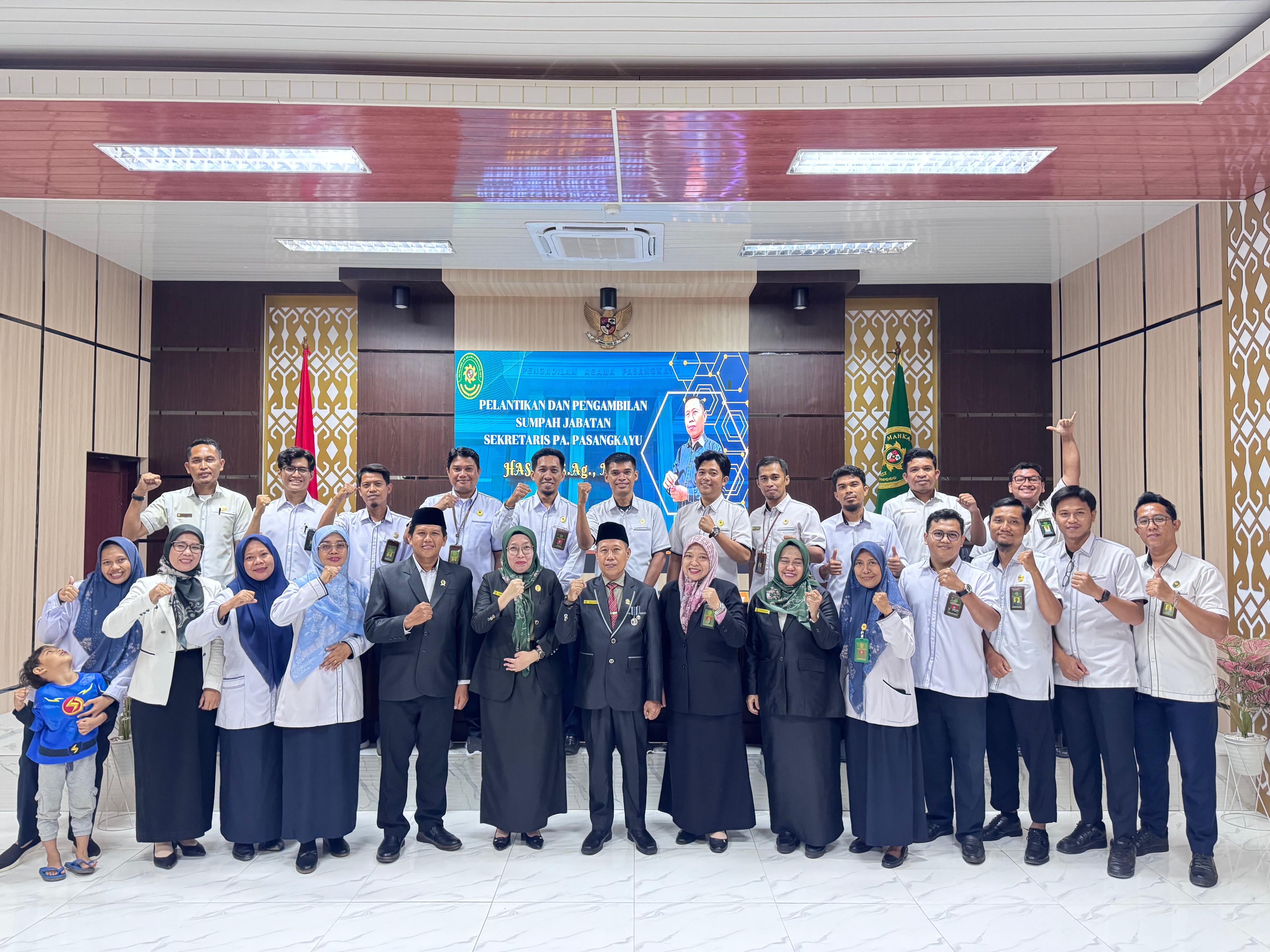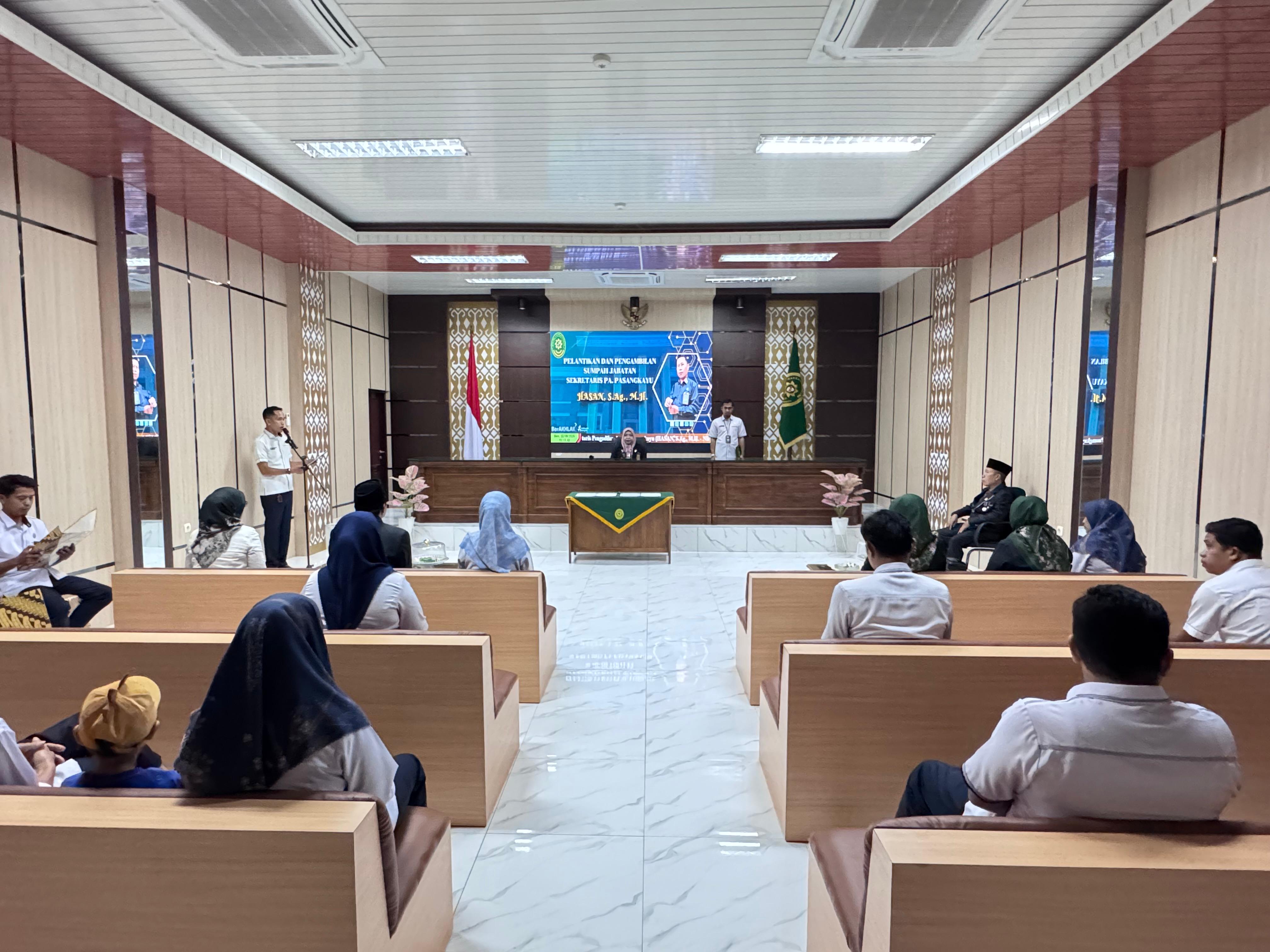 Pengadilan Agama Pasangkayu melaksanakan prosesi Pelantikan dan Pengambilan Sumpah Jabatan terhadap Bapak Hasan, S.Ag., M.H. sebagai Sekretaris Pengadilan Agama Pasangkayu. Acara berlangsung dengan khidmat di ruang Sidang Utama Pengadilan Agama Pasangkayu, dihadiri oleh Ketua, hakim, pejabat struktural dan funsional, tamu undangan dari Pengadilan Agama Majene, serta seluruh staf Pengadilan Agama Pasangkayu.
