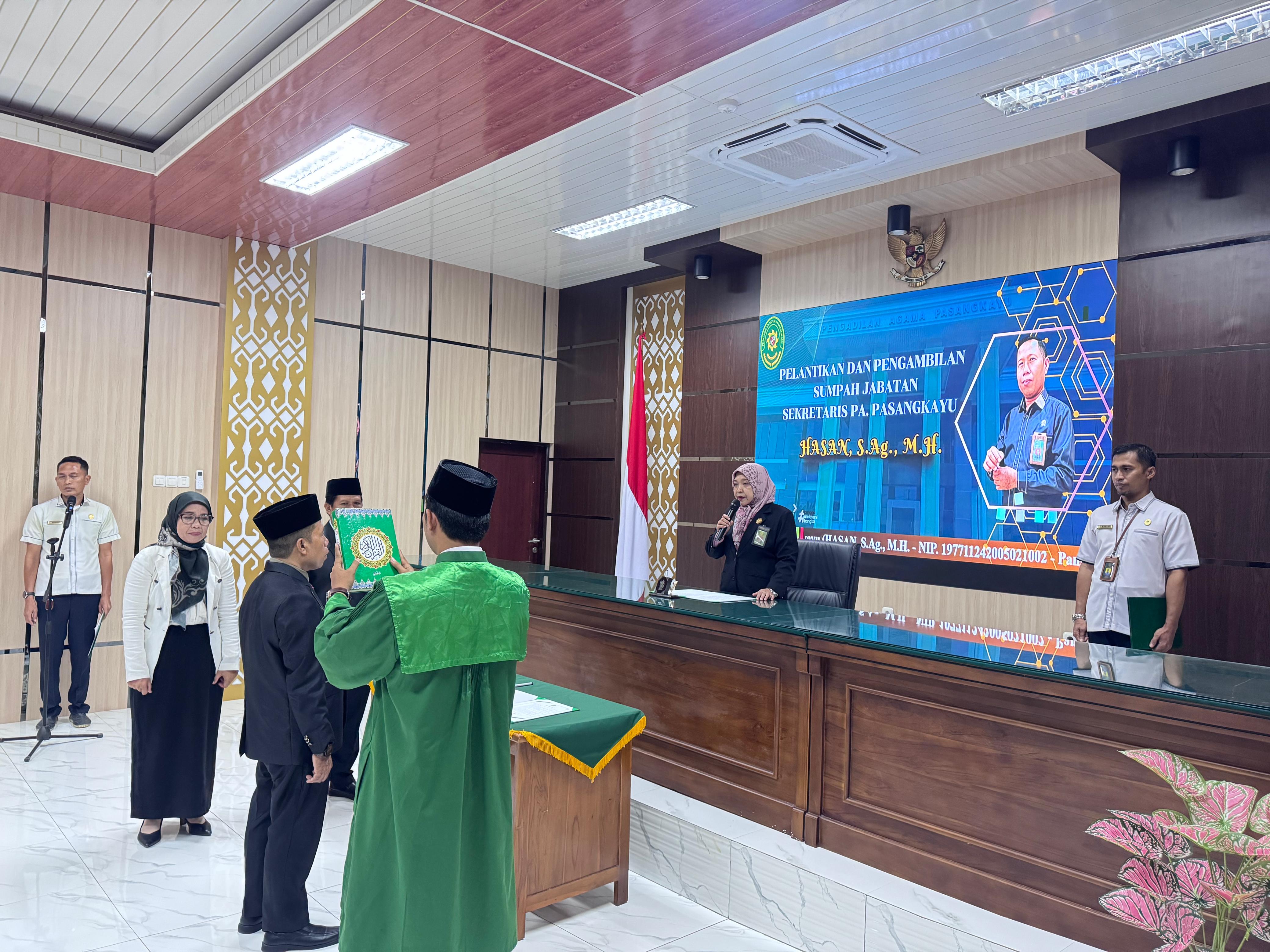 Ketua Pengadilan Agama Pasangkayu, memimpin langsung pelantikan sekaligus mengambil sumpah jabatan, yang disaksikan oleh dua orang saksi, Dalam sambutannya, Ketua Pengadilan Agama Poso menyampaikan harapan besar terhadap amanah baru yang diemban oleh Bapak Hasan. "Kami percaya bahwa dengan pengalaman dan dedikasi yang dimiliki, kehadiran sekretaris baru dapat terus mengokohkan semangat kerja yang sudah terbentuk, bersama merawat integritas, bekerja Lekas dan Cerdas untuk kemajuan Pengadilan Agama Pasangkayu.