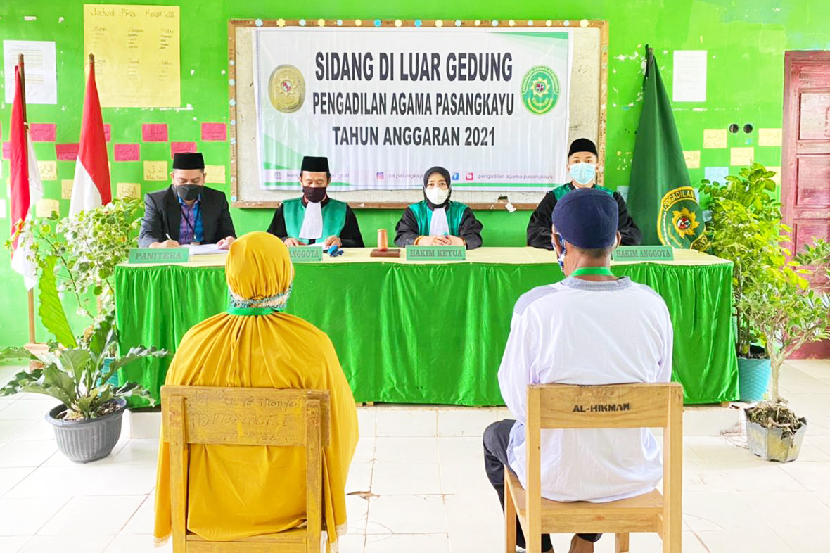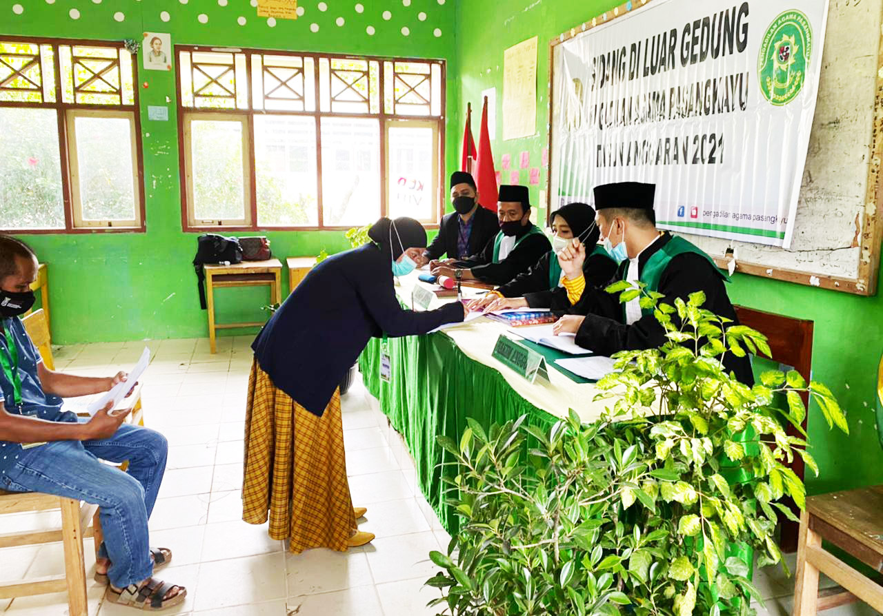 Tim Pengadilan Agama Pasangkayu yang melaksanakan Sidang Di Luar Gedung berjumlah 7 (tujuh) orang aparatur peradilan, terdiri dari 3 (tiga) Hakim, 1 (satu) orang Panitera, 2 (dua) orang Panitera Pengganti, dan 1 (satu) orang Petugas Administrasi. Majelis yang bertugas dipersidangan ini dipimpin oleh Ketua Pengadilan Agama Pasangkayu Hj. Hidayani Paddengngeng, Lc. M.H., didampingi oleh Wakil Ketua Pengadilan Agama Pasangkayu Amar Ma’ruf, S.Ag. M.H., dan Hakim Muh. Irfan, S.H. Jumlah perkara yang disidangkan total berjumlah 7 (tujuh) Perkara. Sehubungan dengan peningkatan Corona Virus Disease 2019 (COVID-19) yang terus menyebar, Pengadilan Agama Pasangkayu juga terus menerapkan standar protokol kesehatan yang diberlakukan pemerintah seperti mencuci tangan, menggunakan masker, dan tetap menjaga jarak.