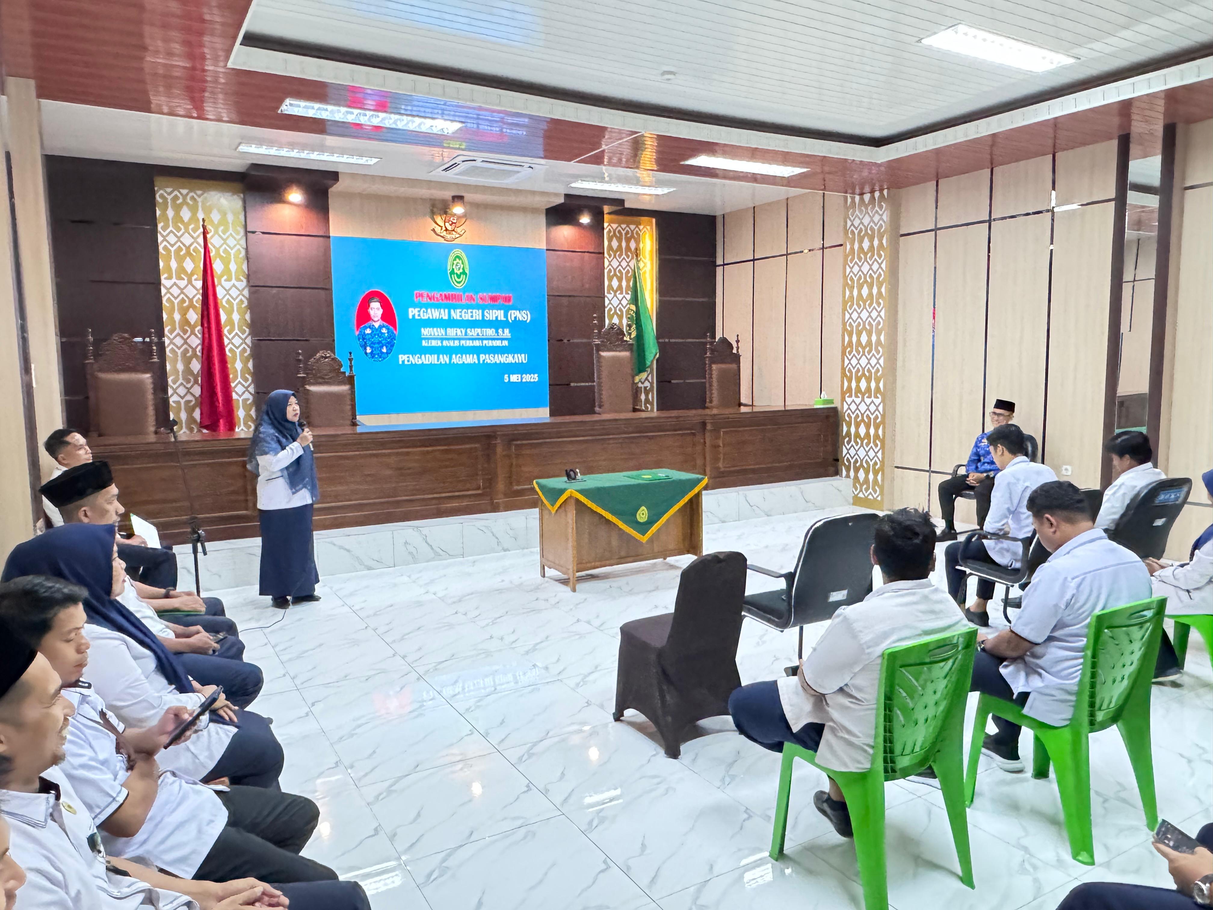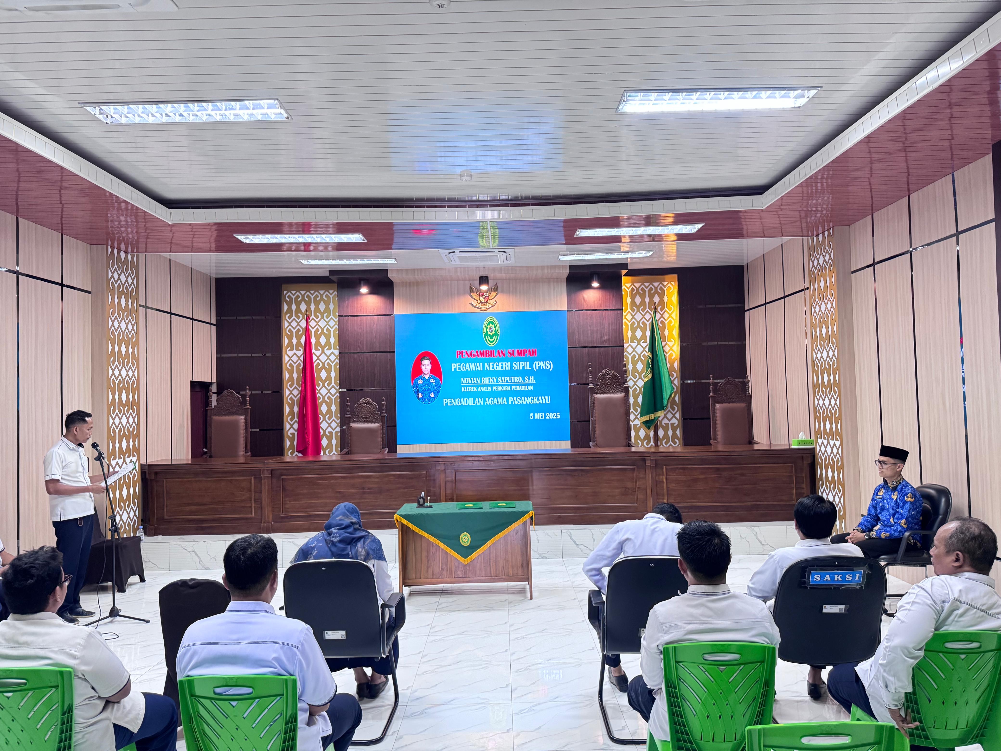 Bertempat di Ruang Sidang Utama Pengadilan Agama Pasangkayu tepat pukul 10.00 Wita dilaksanakan Pengambilan Sumpah Pegawai Negeri Sipil (PNS) sdr Novian Rifky Saputro. S.H. yang sudah mengakhiri masa CPNS sehingga status saat ini sudah resmi menjadi Pegawai Negeri Sipil (PNS) di Pengadilan Agama Pasangkayu. Turut hadir dalam acara Wakil Ketua, Hakim, Panitera, Sekretaris, Pejabat Struktural dan Fungsional serta seluruh pegawai PA Pasangkayu.