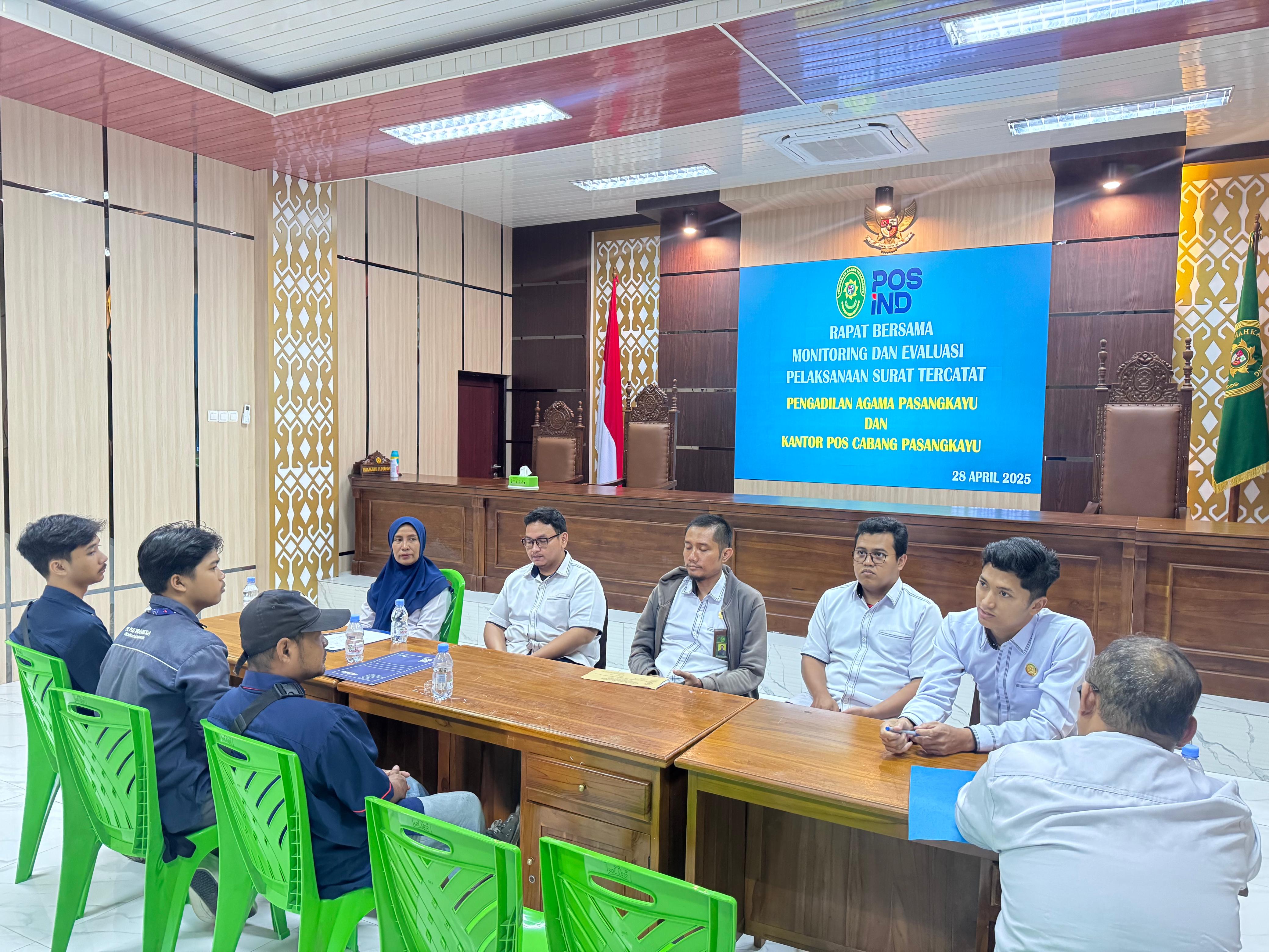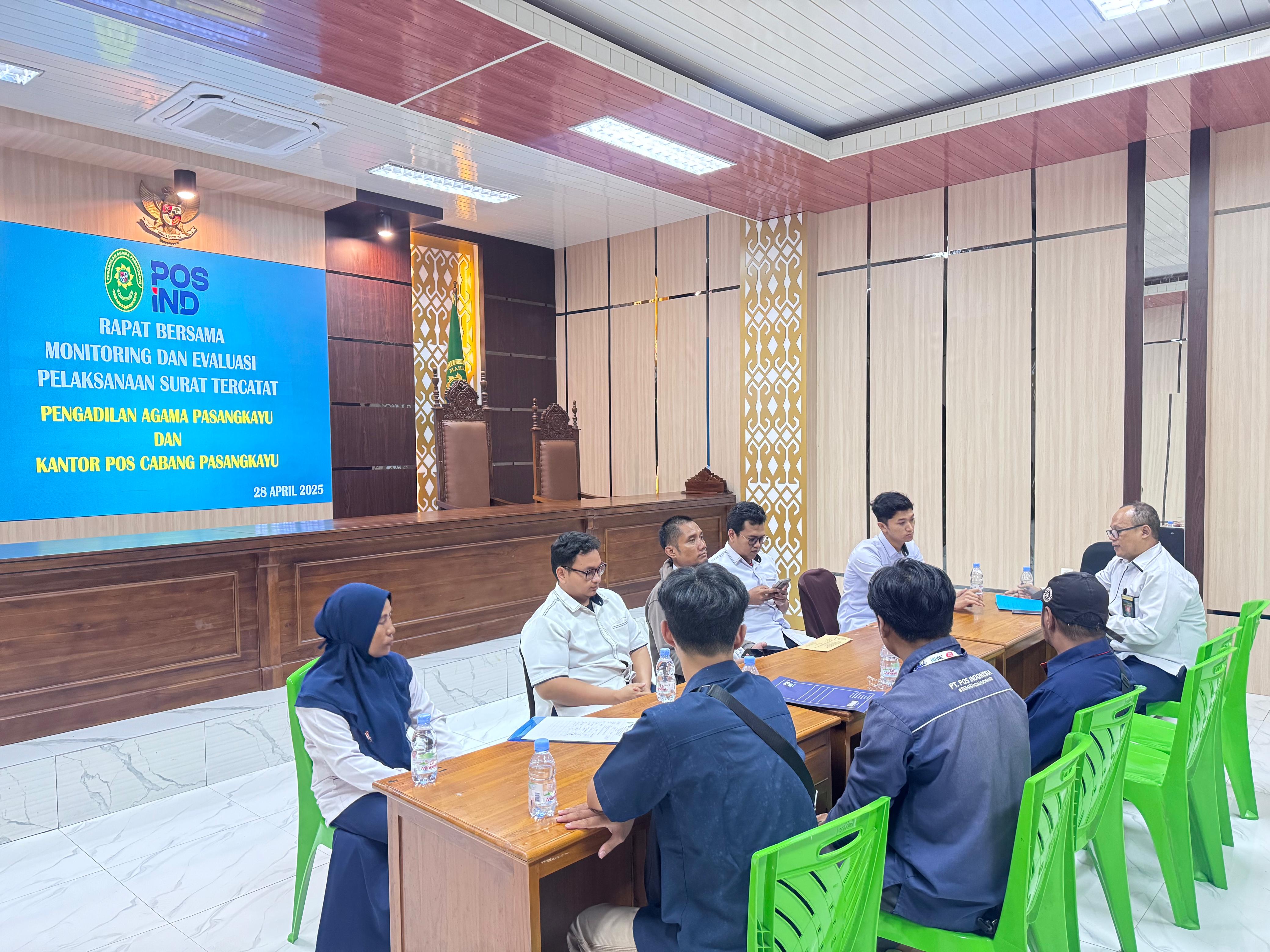 Pengadilan Agama Pasangkayu menggelar Rapat Monitoring dan Evaluasi Pelaksanaan Surat Tercatat bersama PT. Pos Cabang Pasangkayu. Acara ini dipimpin oleh Panitera Pengadilan Agama Pasangkayu, Akyadi, S.I.P., S.H.I., M.H., dan dihadiri oleh seluruh stakeholder Hakim dan Kepaniteraan Pengadilan Agama Pasangkayu.